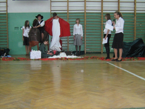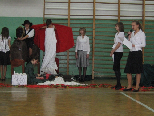 Our gallery presents different views of our symbolic monument of the heroes of the 1863 uprising. This patriotic enterprise united the members of all social classes- among them a Jewish fighter on a horse (wonderfully recreated by Piotrek). Standing together with him are Polish noble woman, wounded peasant and, above them, Mother Poland, spreading her hands in a protecting gesture. Two last pictures show the heroes who left their monuments, the narrators and the 3c class teacher- Magdalena Blizniak.